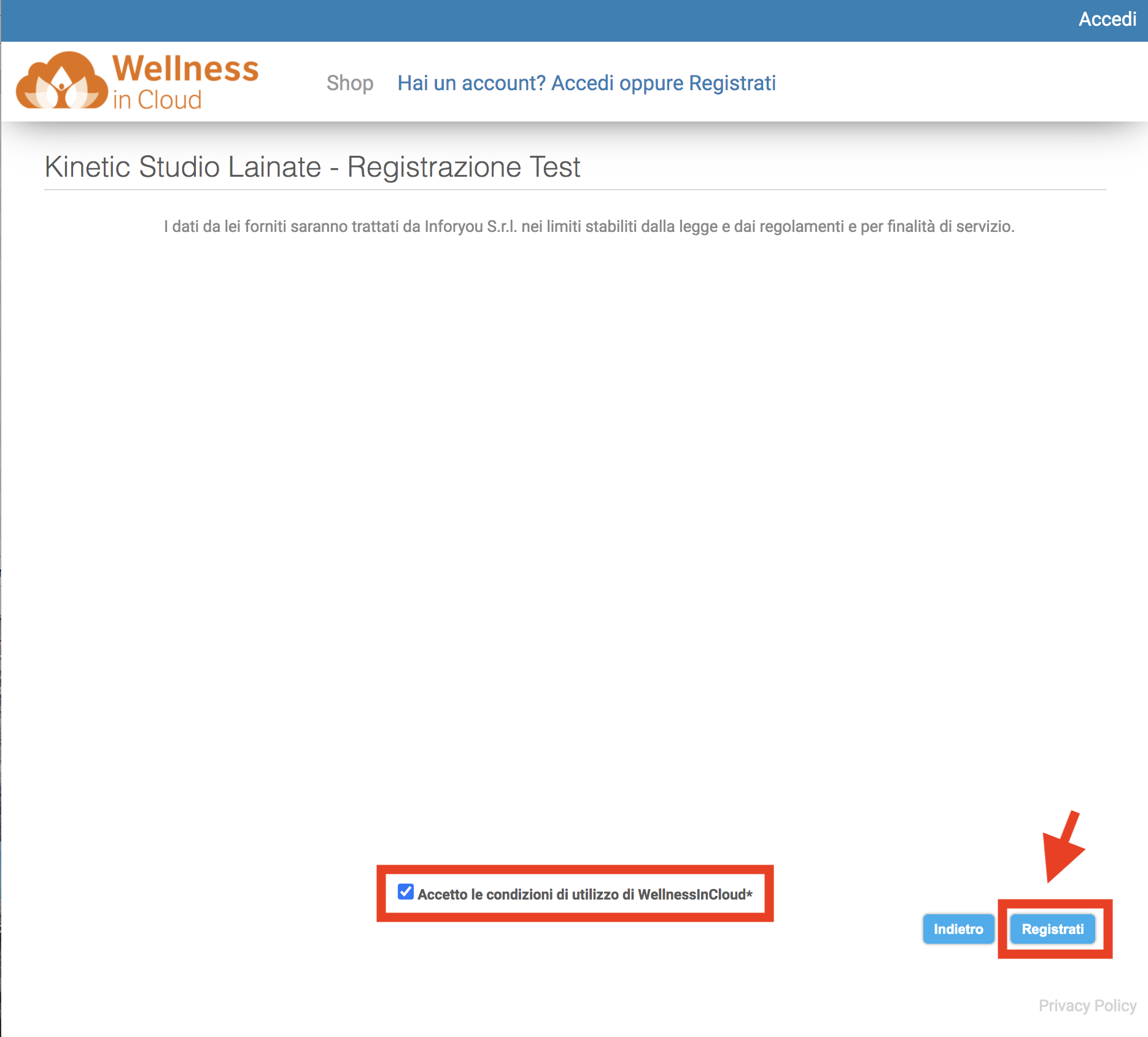 3. Accetta le condizioni di utilizzo dell’App spuntando la casella in basso e clicca registrati